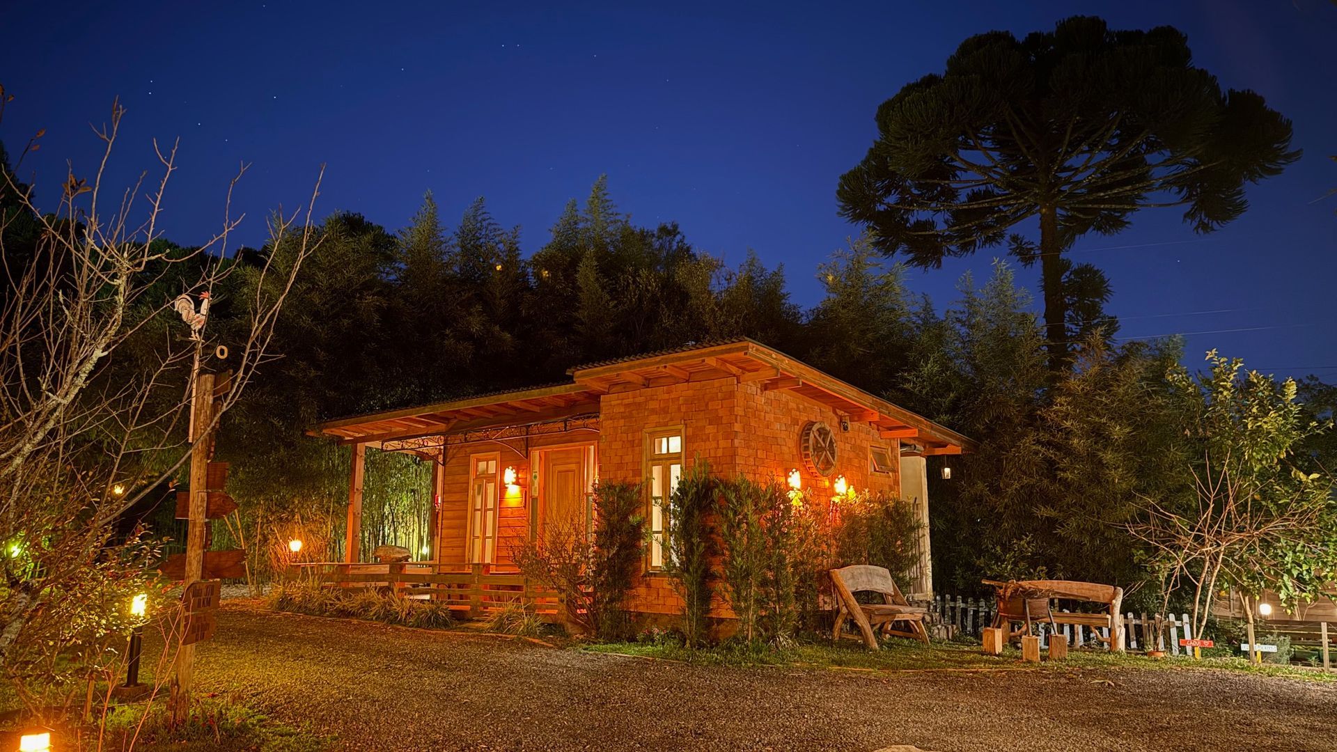 O Chalé Castelinho é uma acomodação de 33 m2, à beira do Riacho que atravessa a propriedade, com vista para o jardim e montanhas de araucárias. Tem varanda privativa, lareira, cozinha equipada, ducha a gás, torneiras aquecidas, ar-condicionado, cama queen-size e um sofá-cama estilo futon tamanho solteiro. Roupas de cama e banho fornecidas. Café da manhã opcional servido no chalé. Acomoda confortavelmente 3 pessoas.